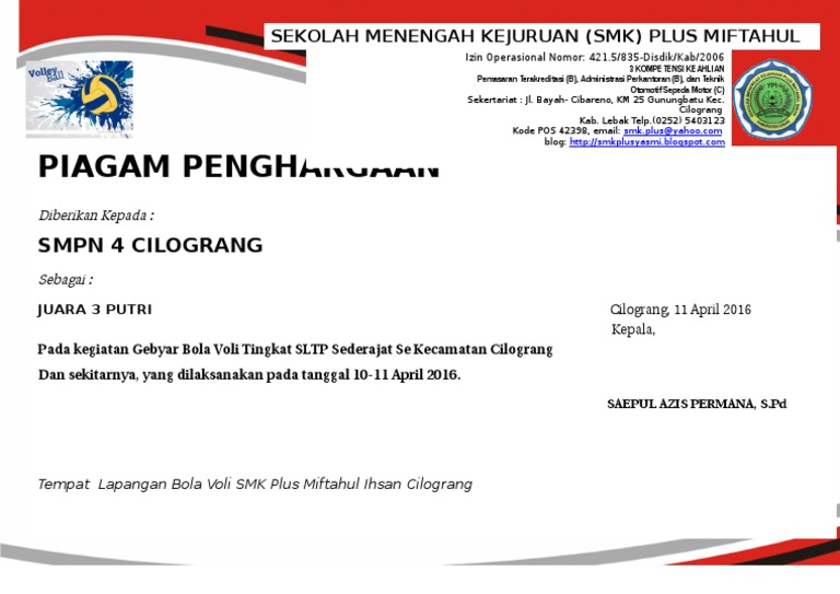 Contoh Piagam Penghargaan Juara Lomba Volley Keren Imago Media Home Of Creativity